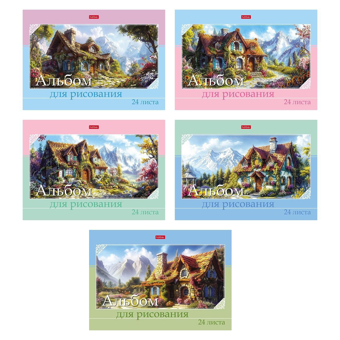 АЛЬБОМ для рисования 24л А4ф на скобе 5 диз.в блоке Soft-touch серия -Живописные домики-