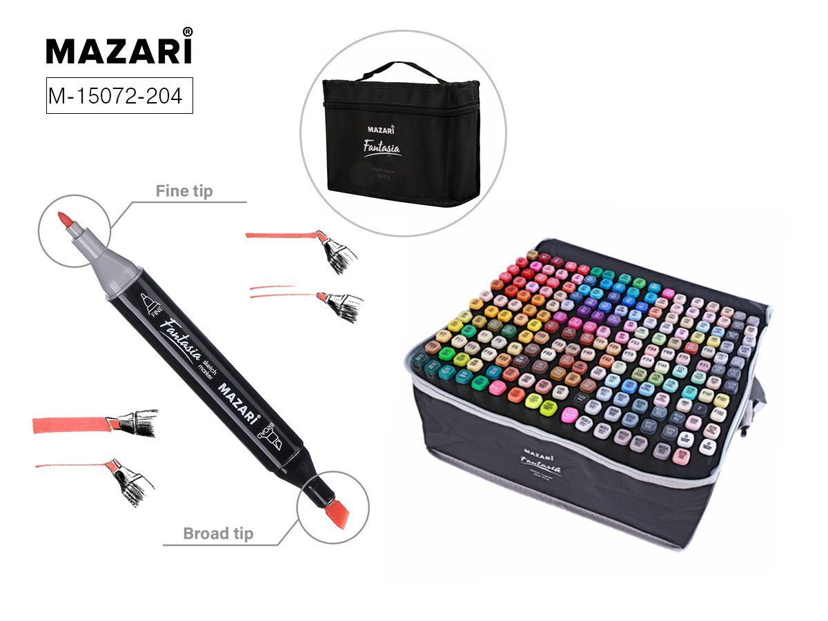 Набор маркеров для скетчинга двусторонних FANTASIA, 204 цв. (в комплекте 2 маркера-блендера), пулевид./клиновид.наконечники, пиш.узлы 3.0-6.2 мм, текс