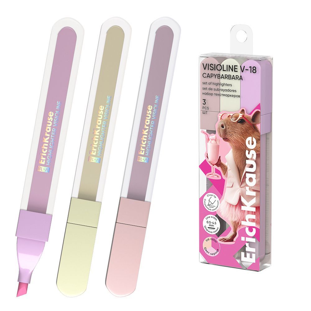 Набор из 3 текстмаркеров ErichKrause Visioline V-18 CapyBarbara, цвет чернил ассорти