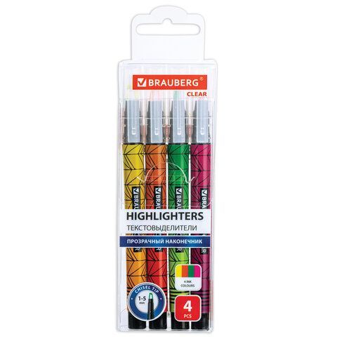 Набор текстовыделителей с прозрачным наконечником 4 ЦВЕТА BRAUBERG Clear, линия 1-5 мм, 152426