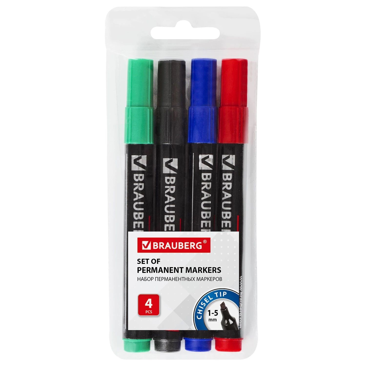 Маркеры перманентные BRAUBERG "Contract", НАБОР 4 ЦВЕТА, скошенный наконечник, 1-5 мм, 150473